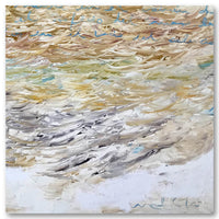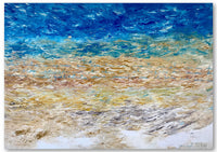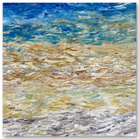 This painting is part of the collection “El Corazón por encima de la Razón” (Heart above Reason). It’s a piece with a unique value since it’s the only piece available from the collection. A sea filled with light and color with waves that subtly graze the beach and part of one of my poems written in the center: “Vivo entre suspiros que acallan mi mente en el vaivén de las olas. Recuerdo ver tu alma en el reflejo del mar. La suave brisa quebranta mis miedos, me hundo en el vacío del silencio del alma enamorada que solo entrega, que solo ama.” (I live among the sighs that silence my mind in the swaying of the waves. I remember seeing your soul in the reflection of the sea. The soft breeze breaks my fears, I sink in the void of the silence of the enamored soul that only gives, that only loves).