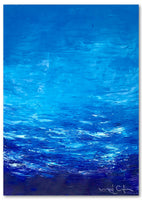 This painting is part of the collection “El Corazón por encima de la Razón” (Heart above Reason). It’s a piece with a unique value since it’s the only piece available from the collection. A sea filled with light and color with waves that subtly graze the beach and part of one of my poems written in the center: “Vivo entre suspiros que acallan mi mente en el vaivén de las olas. Recuerdo ver tu alma en el reflejo del mar. La suave brisa quebranta mis miedos, me hundo en el vacío del silencio del alma enamorada que solo entrega, que solo ama.” (I live among the sighs that silence my mind in the swaying of the waves. I remember seeing your soul in the reflection of the sea. The soft breeze breaks my fears, I sink in the void of the silence of the enamored soul that only gives, that only loves).